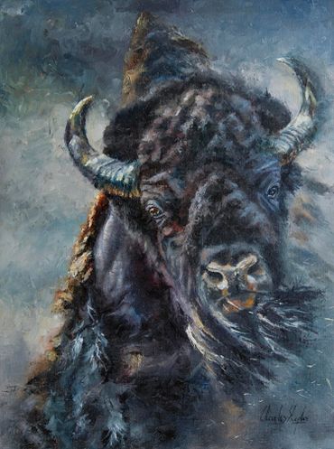 In fact, all of Shipley’s paintings come directly from his experiences. The painting titled ‘Only Six Months Till Spring’ was inspired by a trip to Canada. An early snow that dropped nearly 18” had stranded the Shipleys. The day after the storm, when some of the snow had cleared they were able to drive a short distance from town to find a wild bison herd. One of the bulls was near the top of a hill using his huge head as a bulldozer to remove snow to get to the grass beneath. His head was covered in snow and the sun came out as the clouds cleared revealing the imposing Rocky Mountain Front beyond.