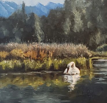 One of their first camping trips in their new home was to the Rocky Mountain Front, along the Sun River. Late in the day, after they had set up camp, the conversation turned to grizzly bears, a common topic in this part of the country. Cindy kept reminding herself of the rareness of grizzly sightings, a stance Shipley labeled as wishful thinking. The next morning they packed up the truck and headed for the plains. Not a half mile from camp, a very large grizzly bounded across the river in front of them. Making the rushing river look like a puddle. A painting was crafted from that experience.